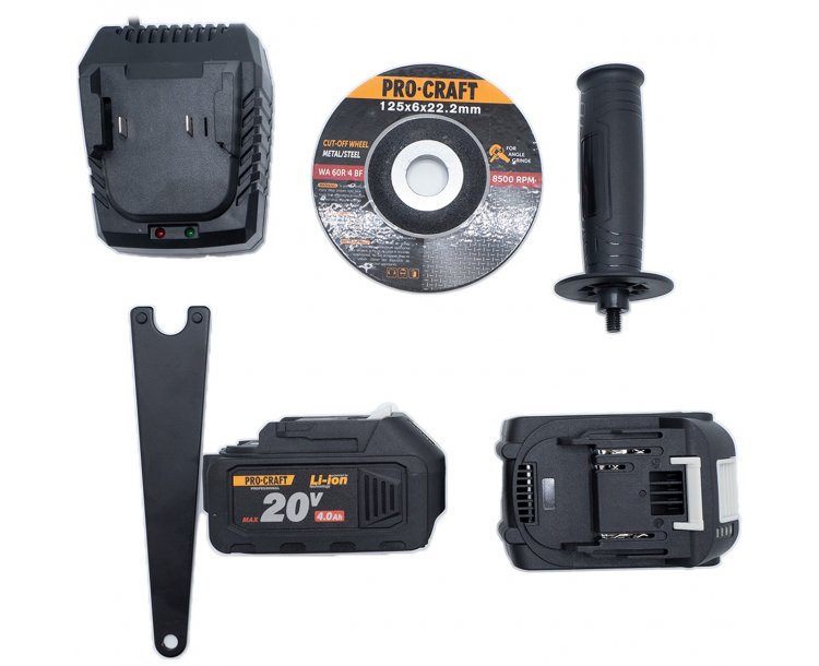Součástí balení: kufr, 2 baterie 20V 4Ah, nabíječka, montážní klíč Bezuhlíkový motor. Regulace otáček. 2 rychlosti. Průměr kotouče: 125mm Otacky: 0-3200/7500min Hmotnost: 2,4kg