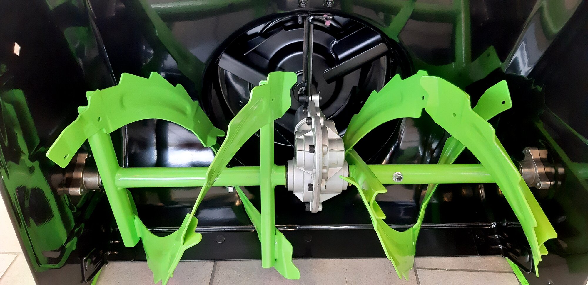 Dvoustupňová AKU sněhová fréza znatelně zvyšuje efektivitu úklidu sněhu ve srovnání s jednostupňovými AKU sněhovými frézami. Frézovací šnek nejdříve zpracuje a nasměruje vrstvu sněhu k výhozovému ventilátoru, který sníh vymrští až do vzdálenosti až 13 metrů. Frézovací mechanizmus a nabírací šnek (1.stupeň) je vyroben z kvalitní, odolné vysocelegované oceli tak, aby se při zpracovávání vrstvy sněhu nekroutil.