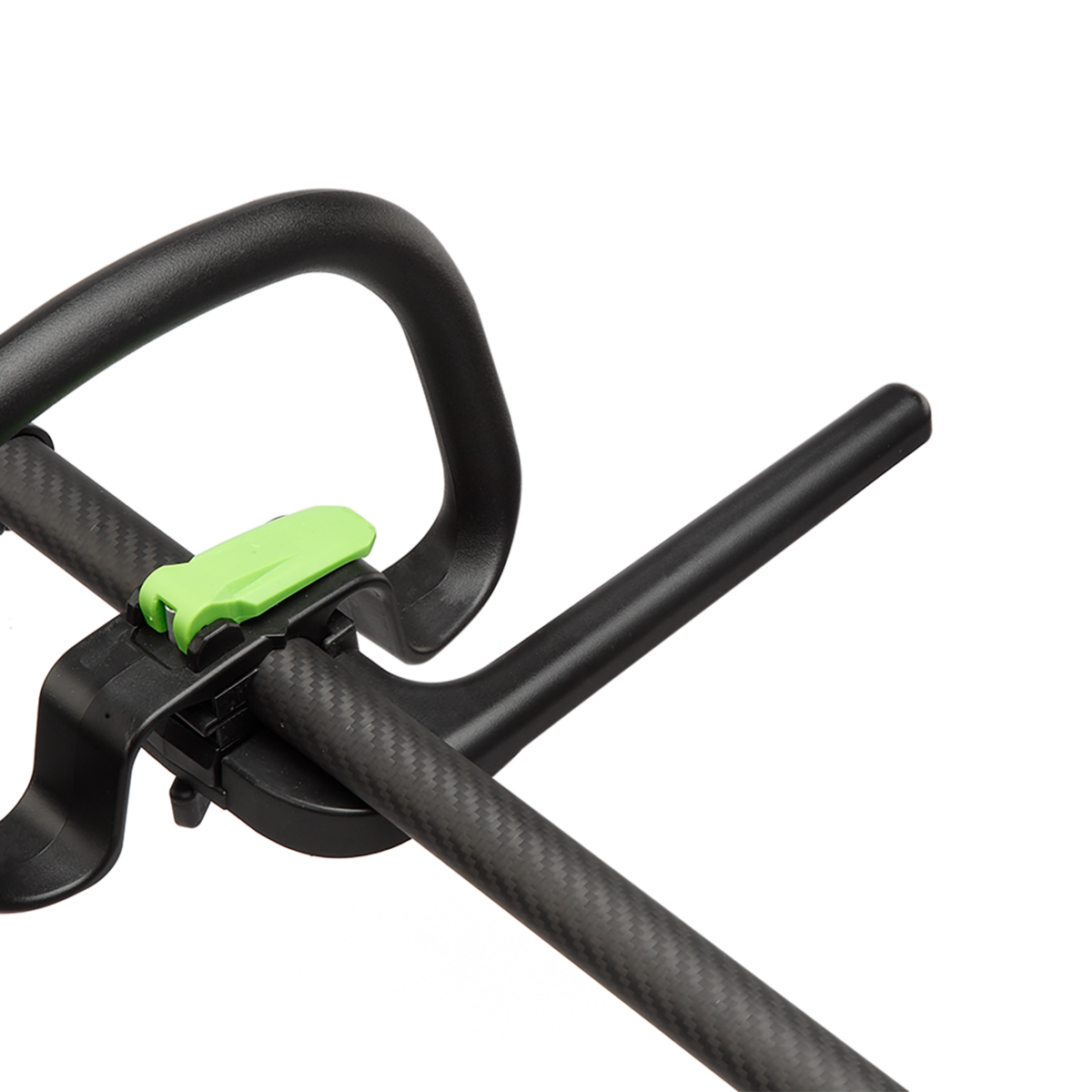 Díky pohodlnému obloukovému madlu je držení křovinořezu při práci velmi stabilní, bezpečné a pohodlné a stroj je vhodný i pro použití s ocelovým travním kotoučem zvláště ve úzkých a stísněných prostorech, kde manipulace s širokými řidítky není možná. Nylonová žací struna o ∅ 2,4 - 3,0mm namotaná na cívce poloautomatické strunové hlavy se v případě potřeby automaticky prodlouží pouhým poklepem strunovou hlavou o zem. Když je zásoba struny na cívce spotřebována, její doplnění je velmi snadné. Dokonalá ochrana před odlétávající trávou je zajištěna díky rozměrnému a robustnímu bezpečnostnímu krytu. Na pohon vyžínače lze použít baterii ze sortimentu EGO Power+ Professional X a např. baterie 28Ah vám umožní pracovat s ocelovým kotoučem nepřetržitě až 7 hodin. Výkonný a účinný bezuhlíkový motor je zavěšen v horní části nosného tubusu, vyrobeného z karbonových vláken. Tubus je tak mnohem lehčí, odolnější a pevnější než běžné hliníkové. Navíc při zatížení a prohnutí se bez problémů vrátí do původní polohy. U hliníkových tubusů hrozí nebezpečí nevratného ohnutí a je nutná výměna. Díky eleasticitě a houževnatosti karbonu tubus absorbuje velkou část vibrací od pracovního nástroje a nepřenáší na řidítka a ruce uživatele. Stroj je vhodné pro dokončovací práce při likvidaci travního porostu jak kolem zídek, plotů, stromů, keřů a jiných překážek, tak i v úzkých a stísněných místech podél domů zídek, plotů s nálety a křovinami. Stroj je mimořádně tichý a vhodný proto na použití v obydlené zástavbě, areálech nemocnic, škol a vůbec všech míst, která jsou citlivá na hlučnost a zápach. Díky nízké hmotnosti, zavěšené na dvojitém profesionálním ramenním postroji a dokonalému vyvážení stroje nepocítíte únavu ani po celodenní práci.