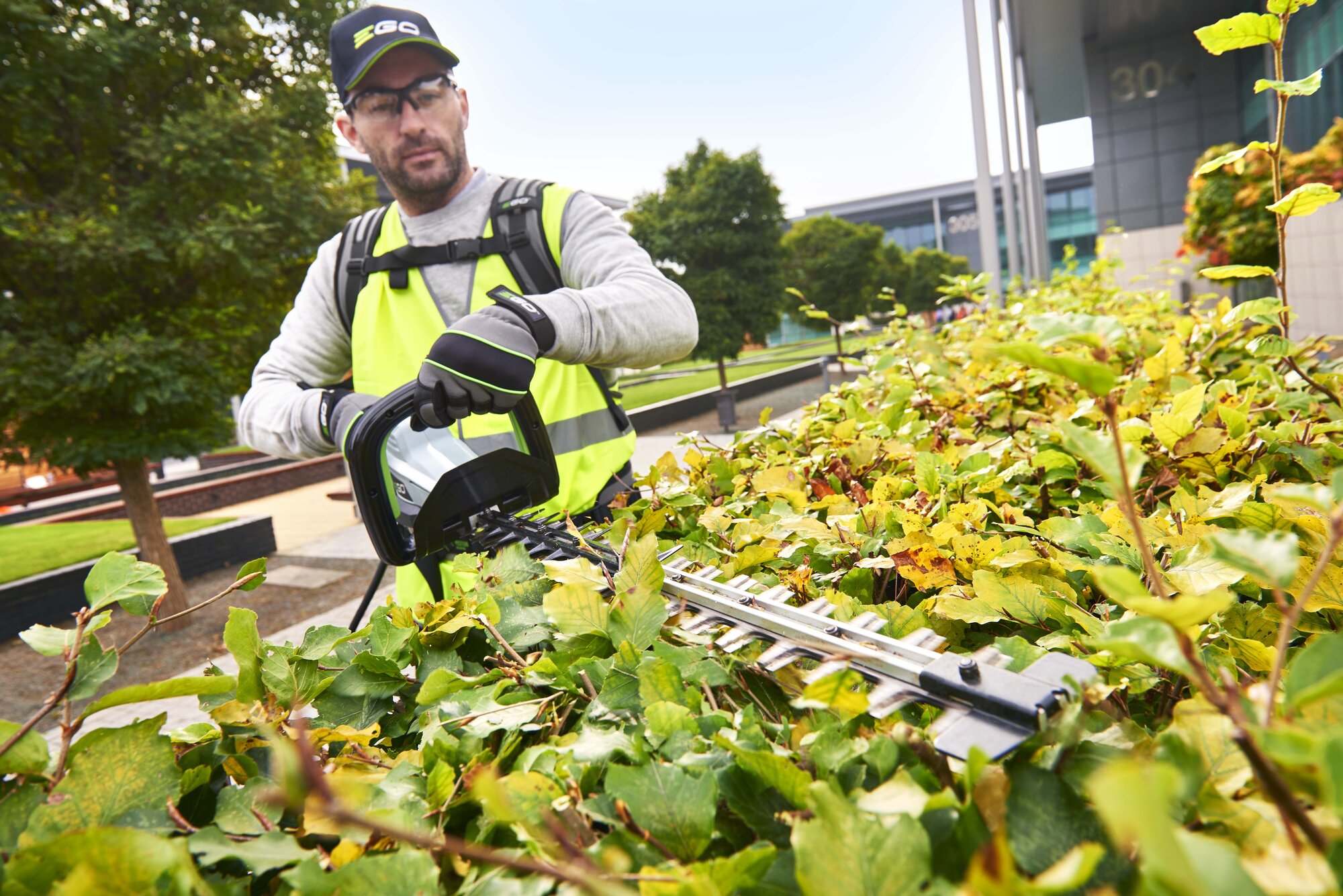 stroje. Na rukojeti je umístněn vypínač, který zajišťuje při stisknutí plynulé a postupné spuštění stroje a variabilitu rychlosti. Na pohon nůžek na živý plot lze použít jakoukoliv baterii ze sortimentu EGO Power+ Professional X a např. baterie 28Ah vám umožní pracovat nepřetržitě až 7 hodin. O pohon se stará výkonný a účinný bezuhlíkový motor s vysokou odolností proti přetížení a přímým náhonem na pracovní nástroj. Stroj je mimořádně tichý a vhodný proto na použití v obydlené zástavbě, areálech nemocnic, škol a vůbec všech míst, která jsou citlivá na hlučnost a zápach. Díky nízké hmotnosti a dobrému vyvážení stroje nepocítíte únavu ani po celodenní práci. Žádná napájecí šňůra, žádné provozní náplně, žádný hluk, žádný zápach. Stroj pro skutečné specialisty na profesionální údržbu zeleně.