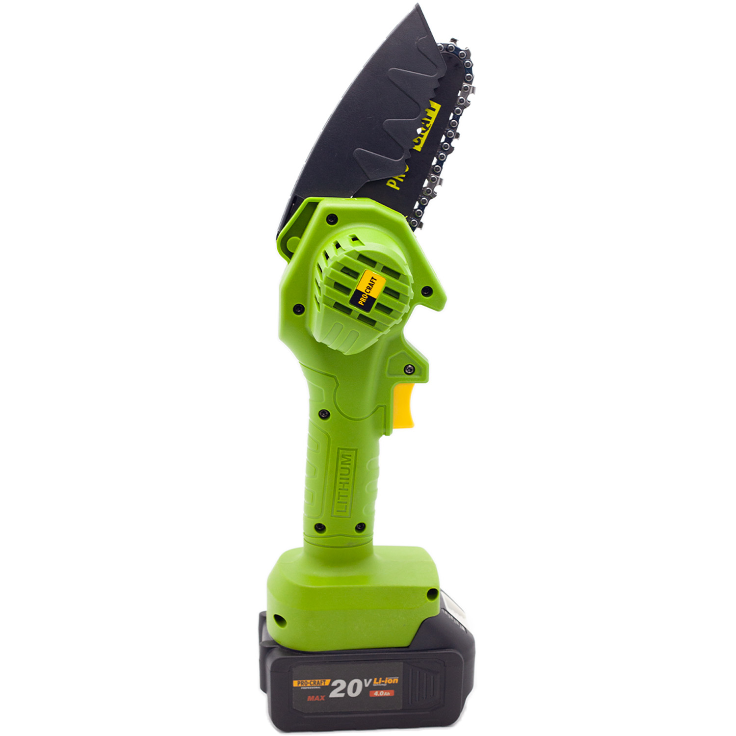 AKU jednoruční řetězová pila je díky svým kompaktím rozměrům užitečným pomocníkem při prořezávání stromů a keřů při práci v omezeném prostoru. Její provoz je v porovnání s většími stroji tichý. Je vybavena ochranou proti zpětnému rázu a bezpečnostním krytem pilového řetězu. Stroj je dodávaný včetně vodící lišty a pilového řetězu v kartonu s montážním klíčem a nádobou na mazací olej - bez akumulátoru a nabíječky.