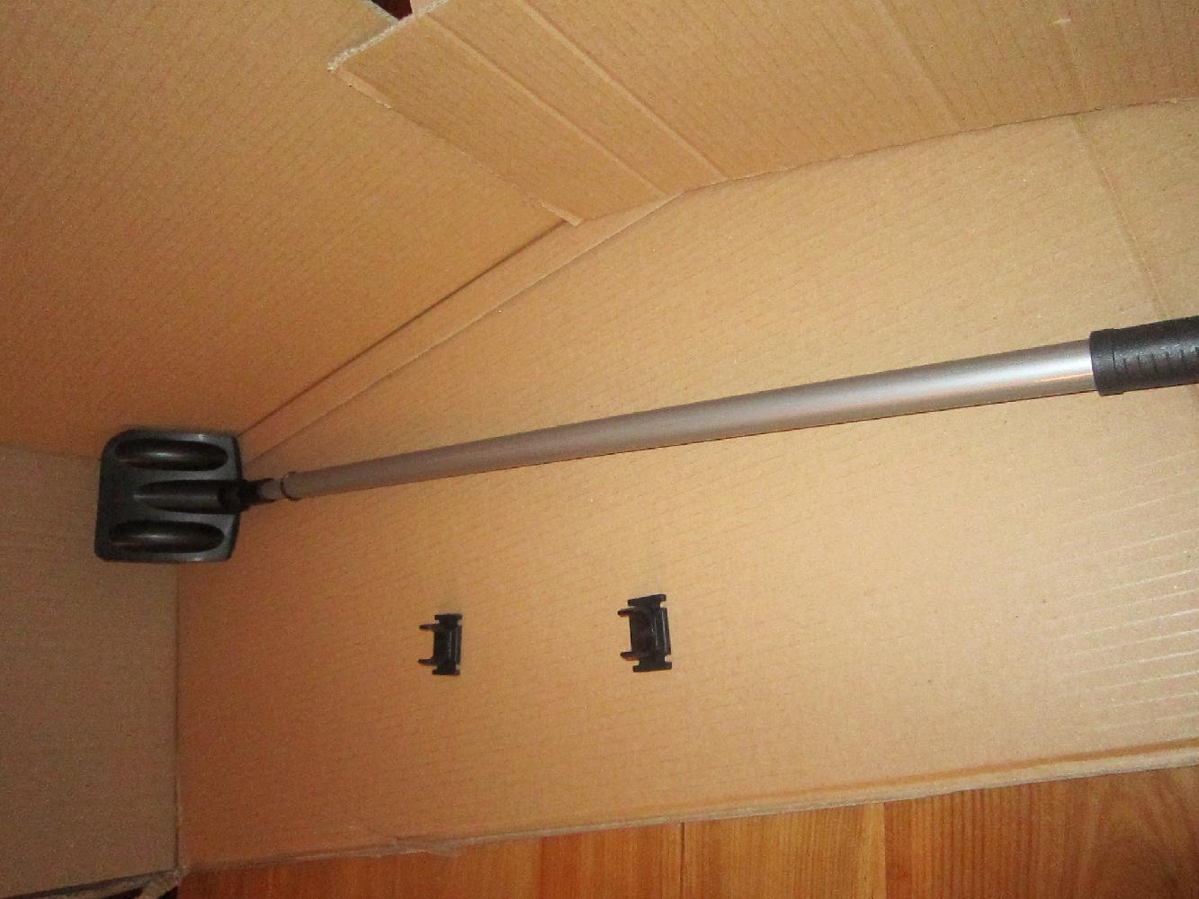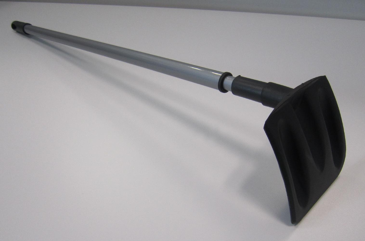 Komín výhozu trávy do sběrného boxu se musí pravidelně kontrolovat a čistit. Tuto činnost vám usnadní teleskopická, výsuvná čistící škrabka. Rovněž v případě, že dojde k zahlcení sekacího zařízení a následnému ucpání komínu výhozu trávy do sběrného boxu, je nutné komín výhozu vyčistit a napěchovanou trávu z komínu výhozu uvolnit. K tomu slouží čistící teleskopická škrabka, kterou lze na traktor upevnit do uchytů, umístěných na horním, plastovém víku sběrného boxu. Po vyčištění komínu výhozu škrabku opět složíme a upevníme do záchytů, připravenou k dalšímu případnému použití.