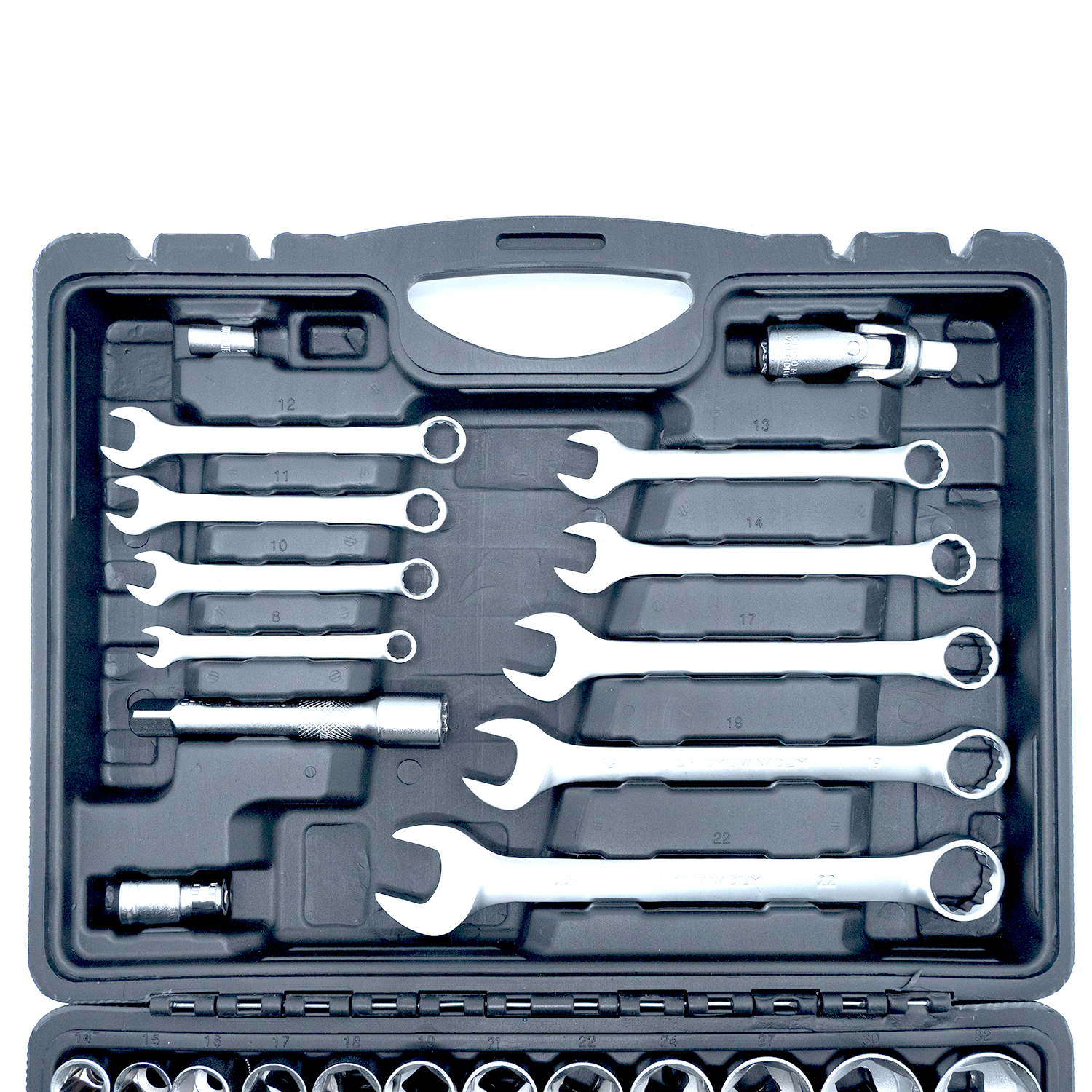 Součástí balení: 12x 1/2" Hlavice nástrčné, 13x 1/4" hlavice nástrčné, 2x 1/4" prodlužovací nástavec, 2x 1/2" prodlužovací nástavec, 1/2" adaptér pro vratidlo vnější 3/4", 1/4" a 1/2" univerzální klouby, 2x 1/2" hlavice nástrčná na zapalovací svíčky, 1/4" a 1/2"ráčny, 1/4" flex-nástavec k nástrčné hlavici: 6", 1/4" rukojeť šroubováku, 1/2" a 1/4" vratidla, 15x 1/2" bity (8 mm), 17x 1/4" bity, 9x očkoploché klíče.
