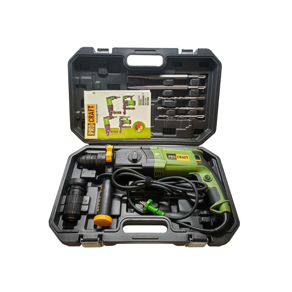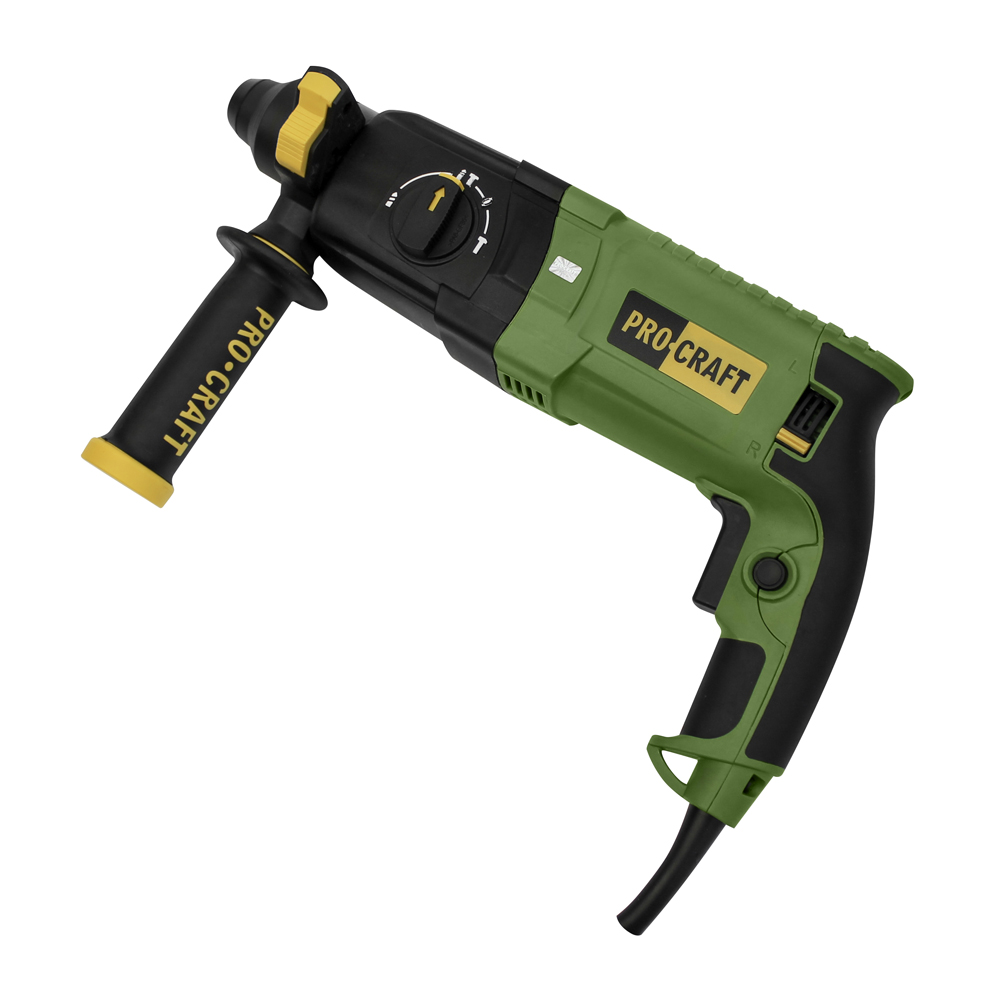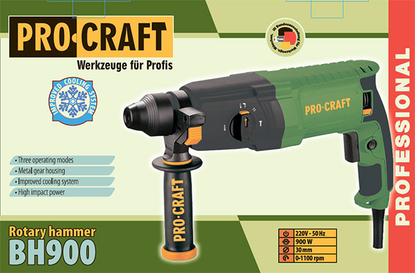 Kombinované kladivo Procraft BH900 je určeno k práci se stavebními materiály jako jsou cihly, beton nebo kámen. Tři přepínatelné funkce zajišťují všestranné využití kladiva: vrtání s příklepem, sekací funkce. Regulace otáček umožňuje nastavení optimálních parametrů při práci s různými materiály. Díky konstrukci může být použito pro domácí a poloprofesionální potřeby. Pravý a levý chod zajišťuje snadné uvolnění zaseknutého vrtáků. Jako příslušenství lze použít SDS Plus příklepové vrtáky do betonu, ploché - špičaté nebo tvarované sekáče na stavební materiály, hadovité (spitálové) vrtáky a dláta do dřeva. Součástí dodávky je plochý a špičatý sekáč, tři vrtáky a přepravní kufr. Balení karton.