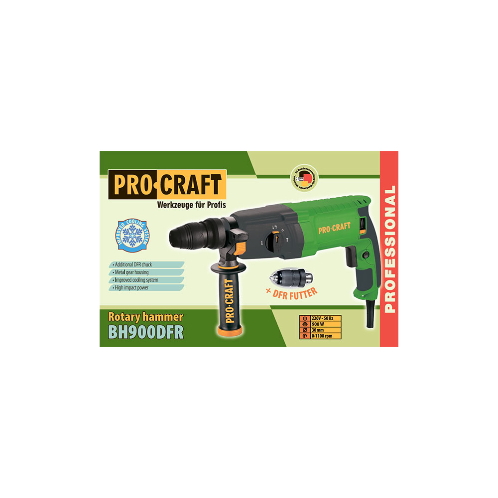 Kombinované kladivo Procraft BH900DFR je určeno k práci se stavebními materiály jako jsou cihly, beton nebo kámen. Tři přepínatelné funkce zajišťují všestranné využití kladiva: vrtání s příklepem, sekací funkce. Regulace otáček umožňuje nastavení optimálních parametrů při práci s různými materiály. Díky konstrukci může být použito pro domácí a poloprofesionální potřeby. Pravý a levý chod zajišťuje snadné uvolnění zaseknutého vrtáků. Jako příslušenství lze použít SDS Plus příklepové vrtáky do betonu, ploché - špičaté nebo tvarované sekáče na stavební materiály, hadovité (spitálové) vrtáky a dláta do dřeva. Balení karton. Druhé rychoupínací sklíčidlo.