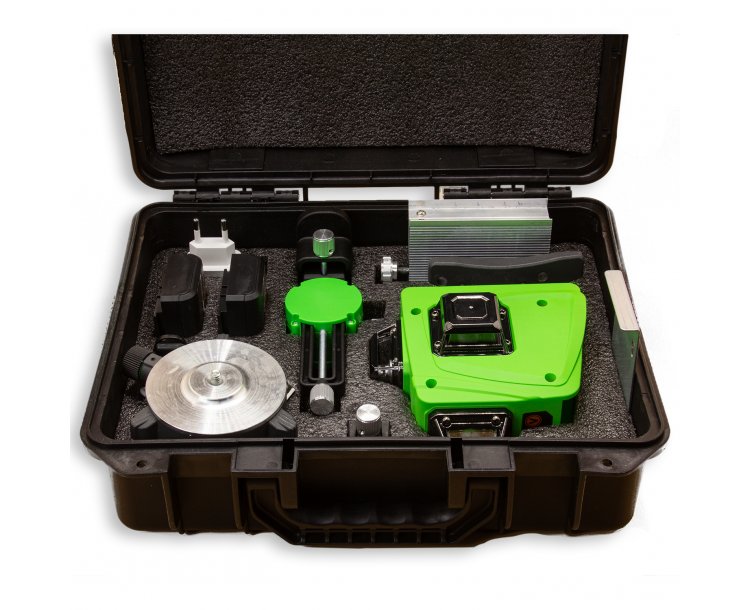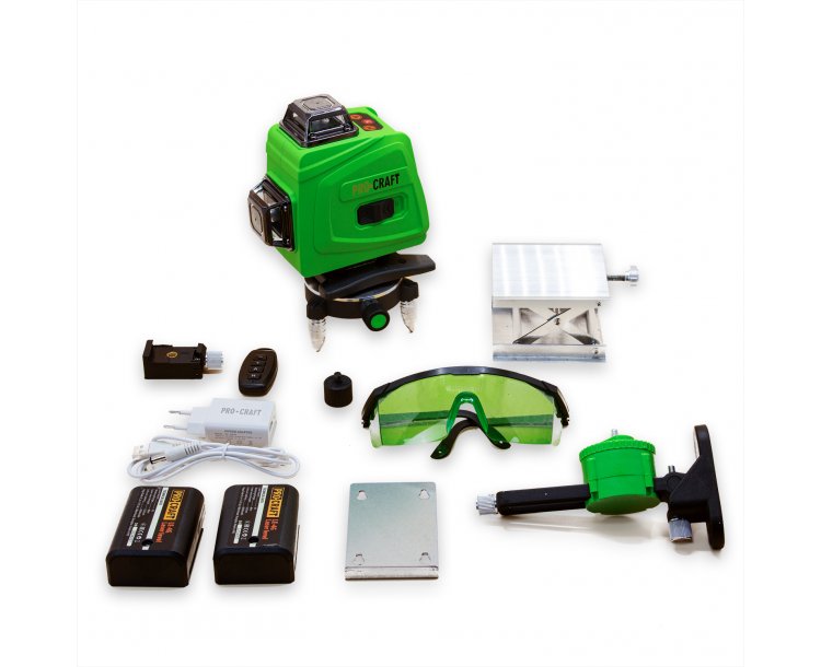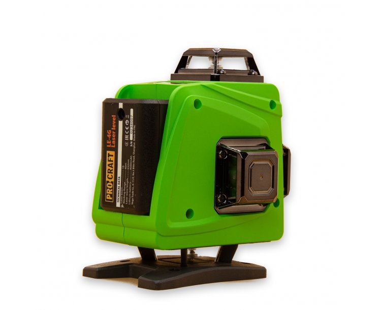 Zelený liniový laser Procraft LE-4G je určen k stanovení svislých a vodorovných linií v interiéru. Zelená čára laseru zaručuje lepší viditelnost na denním světle. Možnost nainstalování na stativ se závitem 1/4». Univerzální napájení přímo ze sítě nebo pomocí dodávaných akumulátorů. Díky automatické samonivelaci v rozsahu ±3° usnadní a zrychlí práci. Vertikální i horizontální úhel vyzařování 360° umožňuje práci v rozměrných a světlých prostorech. Součástí dodávky jsou 2 akumulátory, otočný magnetický držák, dálkový ovladač, ochranné pouzdro, laserové brýle a napájecí adaptér.Druhý spodní paprsek pro horizontální měření samonivelace. Balení karton.