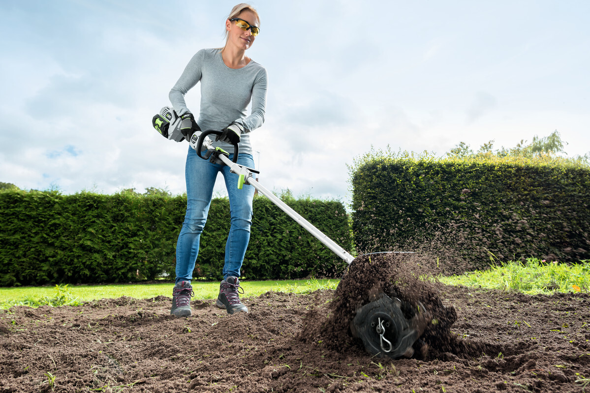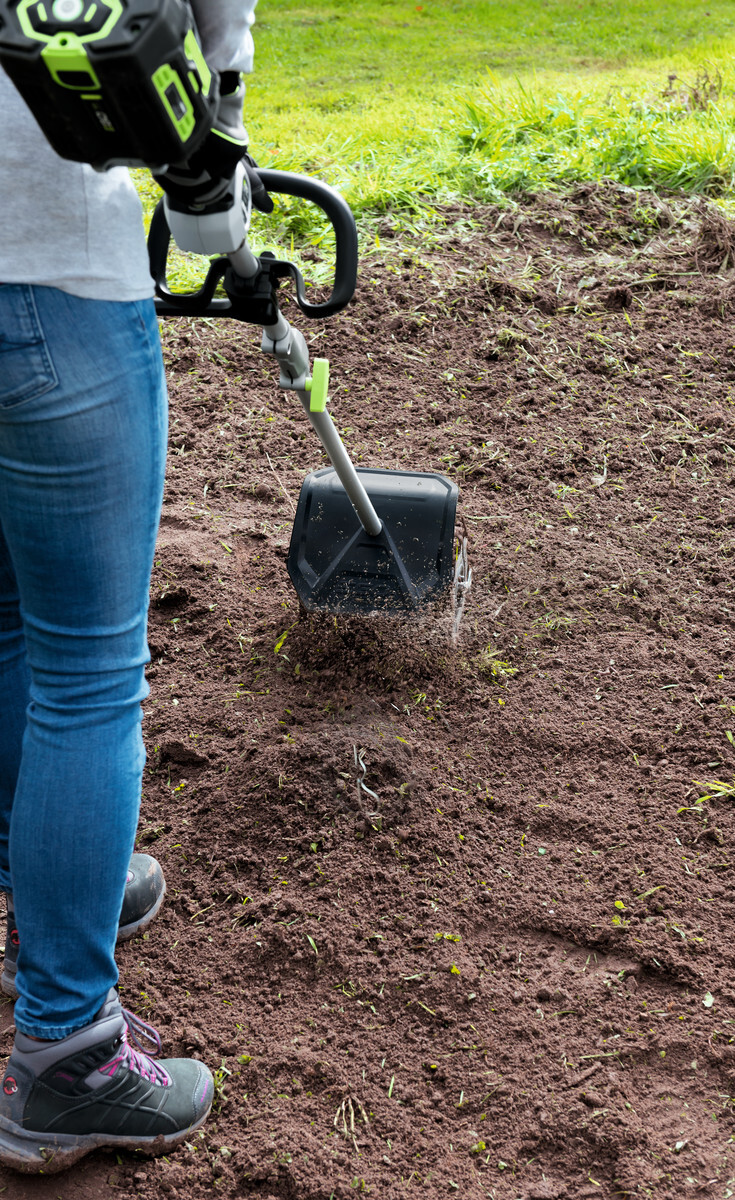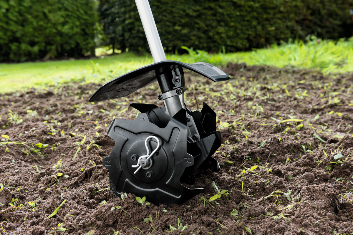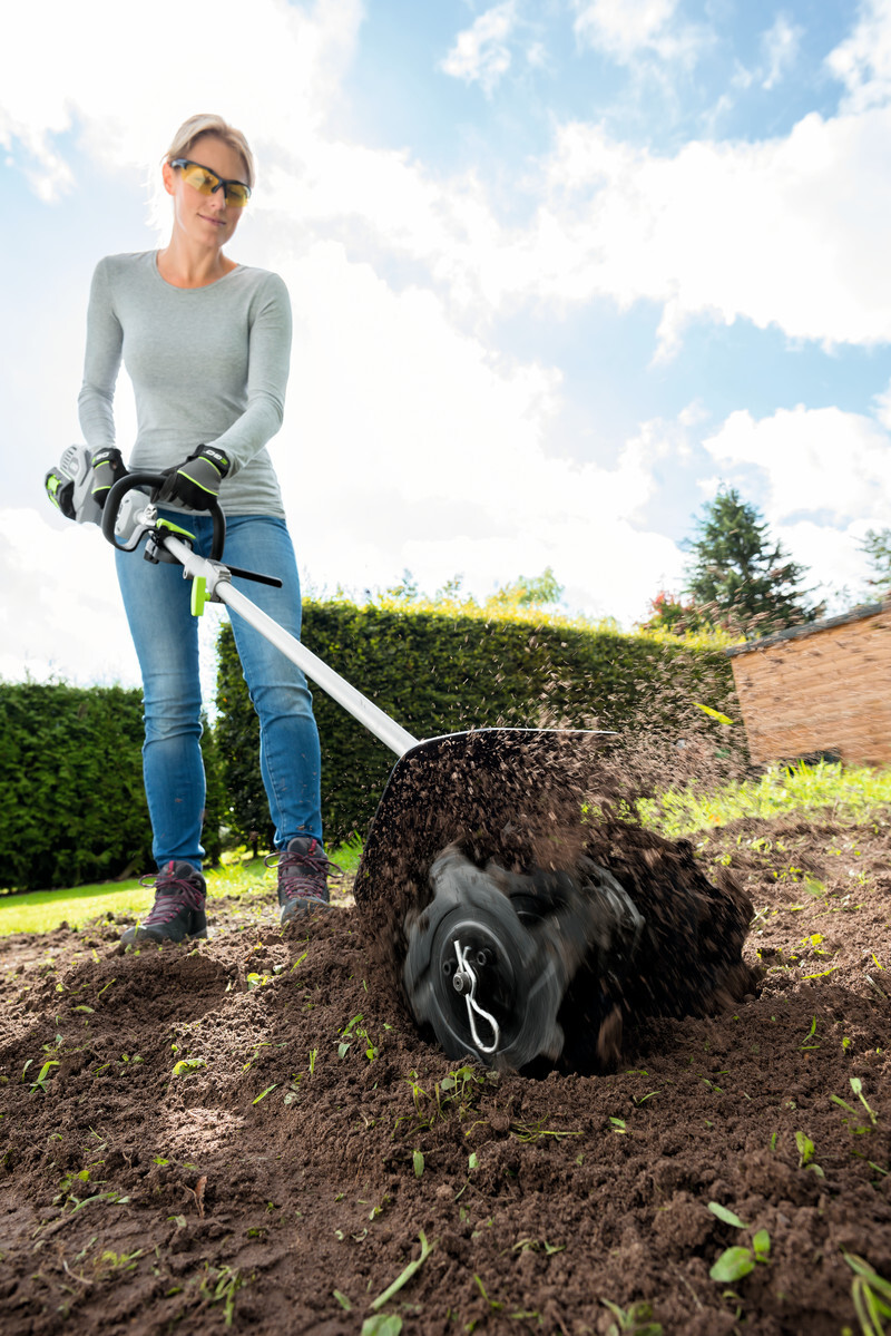 Pokud jste vlastníky malých záhonků pro pěstování zeleniny či okrasných květin, oceníte kompaktnost a přesnost nástavce s minirotavátorem pro kypření půdy na malých záhonech. Pevná převodovka hravě zvládá přenos síly od výkonného bezuhlíkového elektromotoru 56V, napájeného některou z nabídky spolehlivých baterií Ego Power+. Ve spojení s akumulátotovou pohonnou jednotkou se jedná o stroj vhodný pro použití také, kromě malých domácích záhonků, uvnitř uzavřených prostor, jako jsou skleníky či jiné pěstitelské objekty. Prostě nulové emise a hlučnost. Zavěšením celého stroje na jednostranný nosný popruh je práce s rotavátorem snadnou záležitostí.