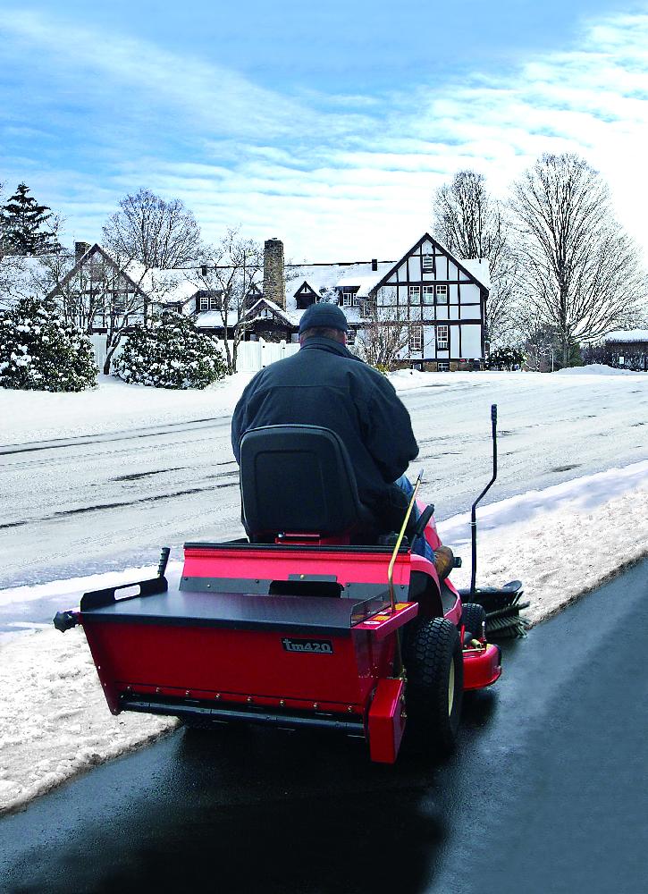 Na zádi traktoru nesený sypač inertního materiálu je poháněný řemenem od adaptéru, namontovaného na střed levého zadního kola traktoru. Je určen pro rozhození jakéhokoliv inertního materiálu rovnoměrně po ploše. Lze jej použít jak pro rozhoz posypového materiálu na kluzkém povrchu, tak i pro případný rozhoz hnojiva na travnaté ploše. Výhodou je možnost použití Čelního zametacího zařízení v kombinaci se záďovým sypačem. Komfortní ovládání plynulé regulace množství posypového materiálu, ovládání zapínání a vypínání rozmetacího mechanizmu je zajištěno z místa řidiče. Sypač je opatřen promíchávacím válcem na rozdrobení hrubého materiálu typu soli nebo jiného granulátu. K sypači lze dokoupit víko násypky.