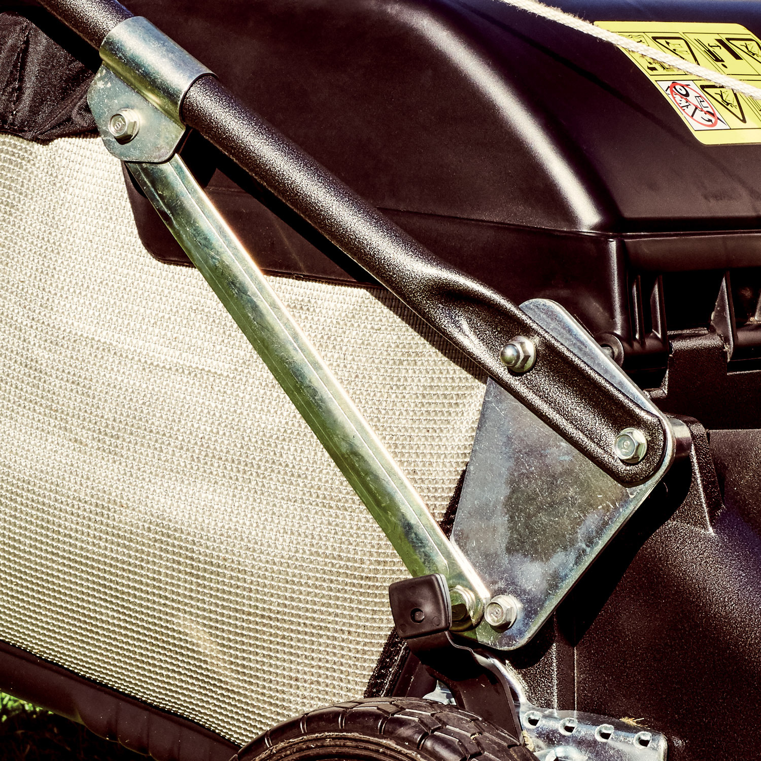 hliníkovými koly na průmyslových ložiscích a ovládací rukojetí namontována k podvozku sekačky s pomocnou vzpěrou a zesilovacím ramínkem.
