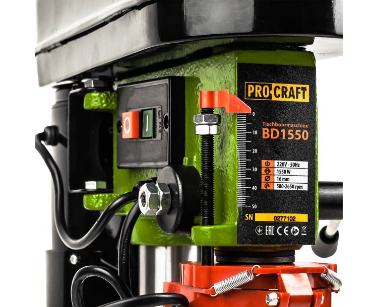 Sloupová vrtačka Procraft BD1550 je určena k vrtání do dřeva, kovu nebo plastů. Regulace otáček v 5 rychlostních stupních vrtání umožňuje nastavení optimálních parametrů při práci s různými materiály. Silný motor s výkonem 375 W a vysokých otáček až 2650 zaručuje dlouhou bezporuchovou práci. Ozubené sklíčidlo umožňuje upnutí vrtáků a stopkových nástrojů do průměru 16 mm. Možnost natáčení pracovního stolu až o 360° a naklápění do úhlu ±45°. Balení karton.