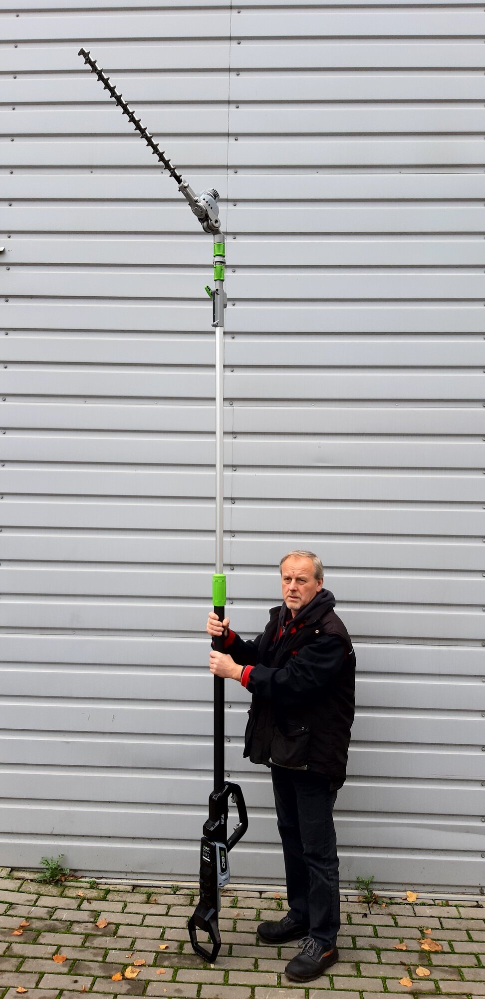 Teleskopické nůžky na živé ploty EGO vám umožní bezpečně a pohodlně zastřihávat a zarovnávat živé ploty ve výškách, kam ani nevidíte nebo si musíte stoupnout na štafle a to při stabilním postoji na zemi bez použití plošiny nebo žebříků. Výsuvný dosah s nůžkami na živé ploty je až 3,7 metru. Svou konstrukcí celý stroj poskytuje mimořádnou mnohostrannost využití jednotlivých pracovních nástavců. V jakékoliv poloze a míře výsuvu je stroj vždy dokonale vyvážen a poskytuje díky perfektní ergonomii mimořádnou míru komfortu. Stroj je určen pro náročné pěstitele zahrad a sadů, ale zejména pro profesionální péči komunálních služeb o stromy, keře a živé oplocení v oblastech citlivých na hluk.